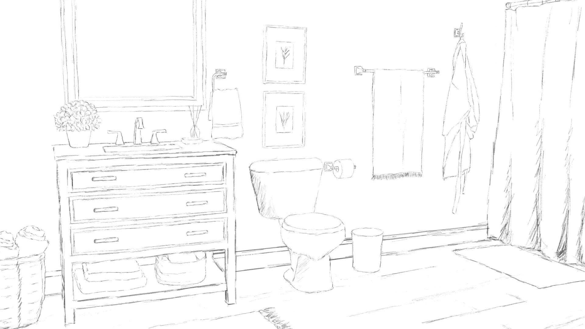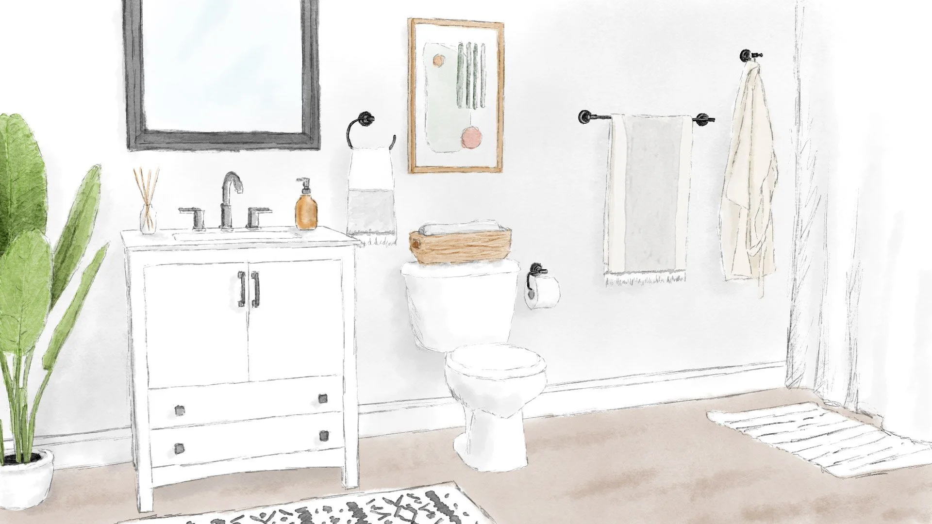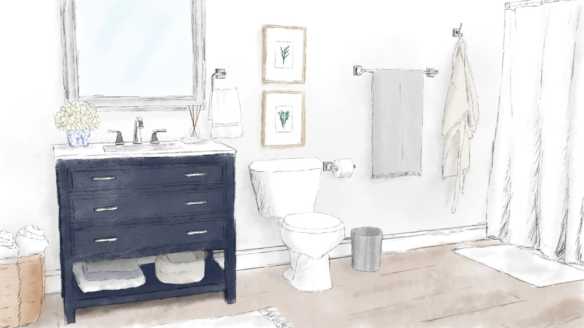 For the video shoot, I created mockups for the set design to help the team decide what was needed for props and framing for each bathroom style. Once sets were shot, I took the images from set and created sketches for each style to be used for a product video.